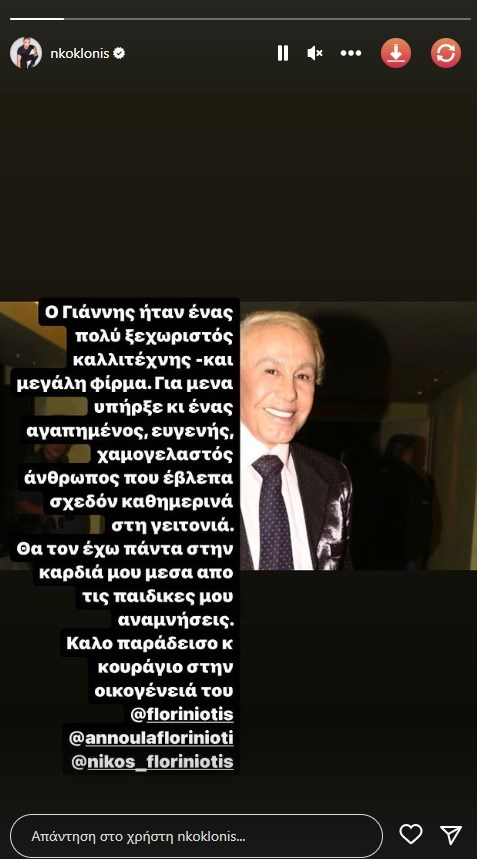 Θα τον έχω πάντα στην καρδιά μου μέσα από τις παιδικές μου αναμνήσεις. Καλό παράδεισο κ κουράγιο στην οικογένειά του .Η ψυχή του Γιάννη ήταν μοναδική πάντα δίπλα σε όλους», έγραψε ο Νίκος Κοκλώνης.