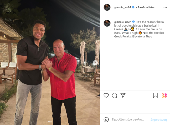 Μάλιστα, ο Γιάννης Αντετοκούνμπο που είναι ιδιαίτερα ενεργός στα social media, ανήρτησε μια φωτογραφία και στην λεζάντα έγραψε: «Είναι ο λόγος που οι περισσότεροι ξεκίνησαν το μπάσκετ στην Ελλάδα. Είδα τη… φωτιά στα μάτια του».