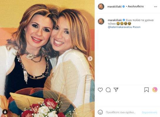 Ενώ με αφορμή το νέο τους βήμα, η Μαρία Ηλιάκη έκανε μια ξεχωριστή ανάρτηση στον προσωπικό της λογαριασμό στο Instagram, αναρτώντας μια φωτογραφία με την Κατερίνα Καραβάτου, η οποία τραβήχτηκε την εποχή του «Κους – Κους» και μία τωρινή.
