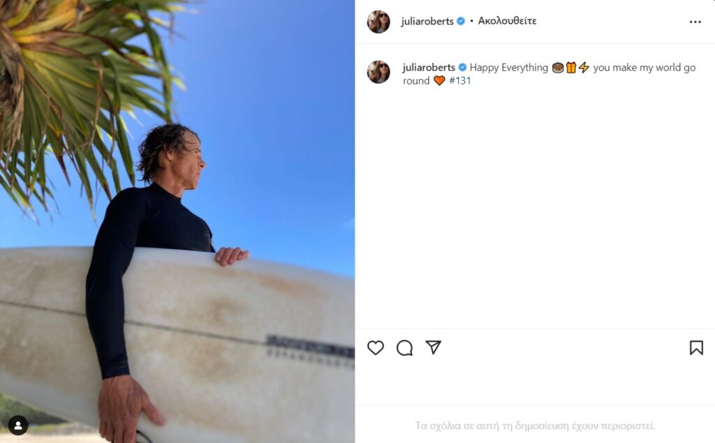 Συγκεκριμένα η Julia Roberts ανέβασε στον προσωπικό της λογαριασμό στο Instagram μια φωτογραφία του Moder που τον δείχνει να κρατάει μια σανίδα του Surf.
