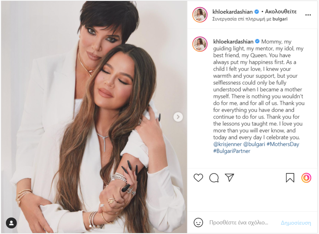 Συγκεκριμένα η Khloe έγραψε στο post της: «Μαμά, το φως που με καθοδηγεί, ο μέντορας μου, το είδωλό μου, ο καλύτερος φίλος μου, η βασίλισσά μου. Πάντα βάζεις την ευτυχία μου πρώτα. Ως παιδί ένιωσα την αγάπη σου, ήξερα τη ζεστασιά και την υποστήριξή σου, αλλά η ανιδιοτέλεια σου μπορούσε να γίνει κατανοητή μόνο όταν έγινα ίδια η μητέρα μου.
