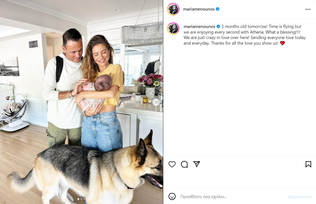 «Αύριο κλείνουμε τρεις μήνες. Ο χρόνος κυλά αλλά εμείς απολαμβάνουμε κάθε δευτερόλεπτο με την Αθηνά. Τι ευλογία!!!! Είμαστε τρελά ερωτευμένοι εδώ! Στέλνοντας αγάπη σε όλους σήμερα και καθημερινά. Ευχαριστούμε για όλη την αγάπη που μας δείχνετε!», έγραψε η Maria Menounos στη λεζάντα της ανάρτησής της.