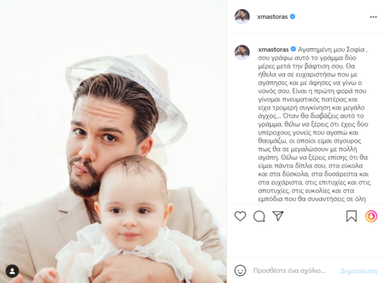 Ενώ δύο ημέρες μετά το μυστήριο ο τραγουδιστής που είναι ιδιαίτερα ενεργός στα social media, μοιράστηκε με τους followers του στο Instagram μία φωτογραφία με τη βαφτιστήρα του, αλλά και ένα συγκινητικό γράμμα που έγραψε για αυτή.