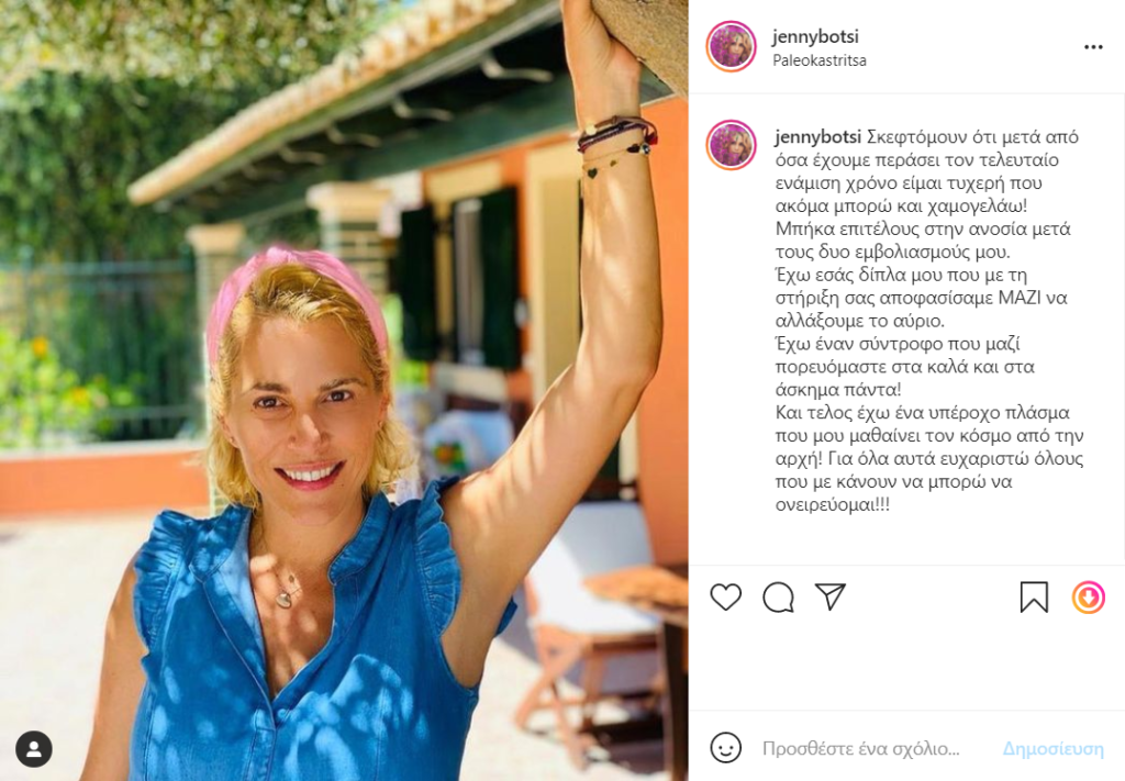 Έχω έναν σύντροφο που μαζί πορευόμαστε στα καλά και στα άσκημα πάντα! Και τελος έχω ένα υπέροχο πλάσμα που μου μαθαίνει τον κόσμο από την αρχή! Για όλα αυτά ευχαριστώ όλους που με κάνουν να μπορώ να ονειρεύομαι!!!», έγραψε η Τζένη Μπότση στη λεζάντα της ανάρτησης της.