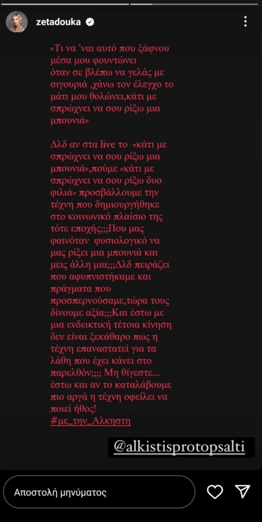 Παράλληλα η Ζέτα Δούκα δημοσίευσε μέρος των στίχων του τραγουδιού «Σταρ του σινεμά» του Νίκου Ζιώγαλα και σχολίασε: