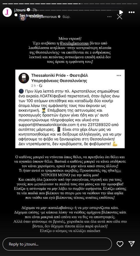 Ελπίζω η αστυνομία να μην πάρει το συμβάν αψήφιστα. Ελπίζω επίσης τα νέα παιδιά που βλέπουν τα Story μου, να νιώθουν την ίδια αηδία που νιώθω και εγώ βλέποντας τέτοιες αναίτιες επιθέσεις! Δέχομαι να μην «καταλαβαίνεις» ή να μην ενστερνίζεσαι κάτι. Δέχομαι επίσης – με κάποια λύπη – να νιώθεις αμήχανα βλέποντας κάτι που είναι μακριά από εσένα και να θες να αποστραφείς. Αλλά όταν φτάνουμε σε βρισιές, χειροδικία και όλα αυτά που είδα στο βίντεο, δεν δέχομαι τίποτα άλλο παρά φυλακή! Ελπίζω ο κόσμος να αλλάξει mindset», έγραψε η Ιωάννα Τούνη στην ανάρτησή της φανερά εκνευρισμένη.