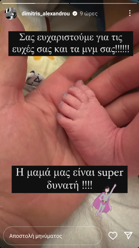«Σας ευχαριστούμε για τις ευχές και τα μηνύματά σας. Η μαμά είναι super δυνατή» έγραψε ο Δημήτρης στο post του, ενώ παράλληλα δημοσίευσε την πρώτη φωτογραφία του γιου του.