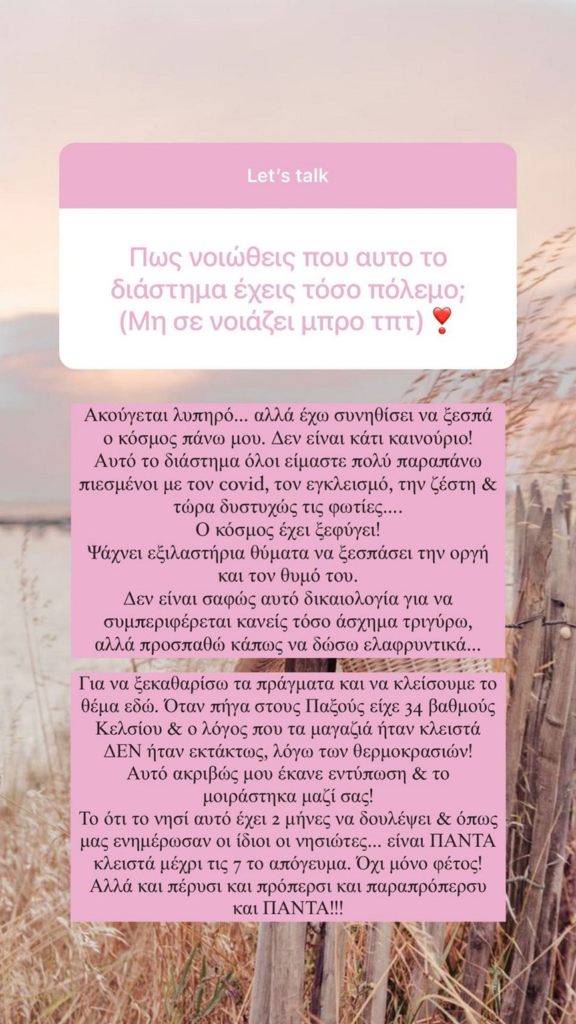 Μάλιστα, η Influencer δεν δίστασε να μιλήσει για τα αρνητικά σχόλια που έχει δεχτεί κατά καιρούς, ενώ αναφέρθηκε και στο post που προκάλεσε αντιδράσεις με το ταξίδι της στους Παξούς.
