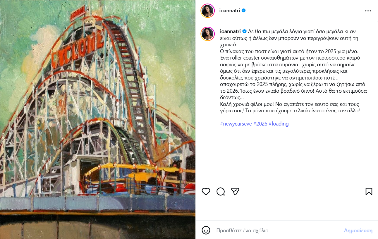 «Δε θα πω μεγάλα λόγια γιατί όσο μεγάλα κι αν είναι ούτως ή άλλως δεν μπορούν να περιγράψουν αυτή τη χρονιά… Ο πίνακας του ποστ είναι γιατί αυτό ήταν το 2025 για μένα. Ένα roller coaster συναισθημάτων με τον περισσότερο καιρό σαφώς να με βρίσκει στα ουράνια.. χωρίς αυτό να σημαίνει όμως ότι δεν έφερε και τις μεγαλύτερες προκλήσεις και δυσκολίες που χρειάστηκε να αντιμετωπίσω ποτέ.. αποχαιρετώ το 2025 πλήρης, χωρίς να ξέρω τι να ζητήσω από το 2026.
