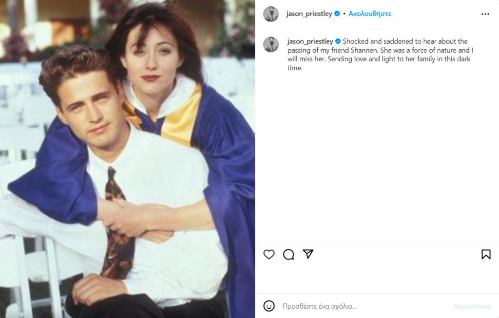 Ωστόσο, ο Jason Priestley που πρωταγωνιστούσε μαζί με την Doherty στο Beverly Hills και έκανε τον αδερφό της, την αποχαιρέτησε μέσα από μία συγκινητική ανάρτηση στον λογαριασμό του στο instagram.
