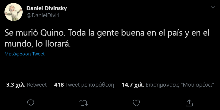 Ο Αργεντίνος σκιτσογράφος Κίνο, ο «μπαμπάς» της Μαφάλντας, έφυγε από την σε ηλικία 88 ετών, όπως ανακοίνωσε ο εκδότης του, Daniel Divinsky.