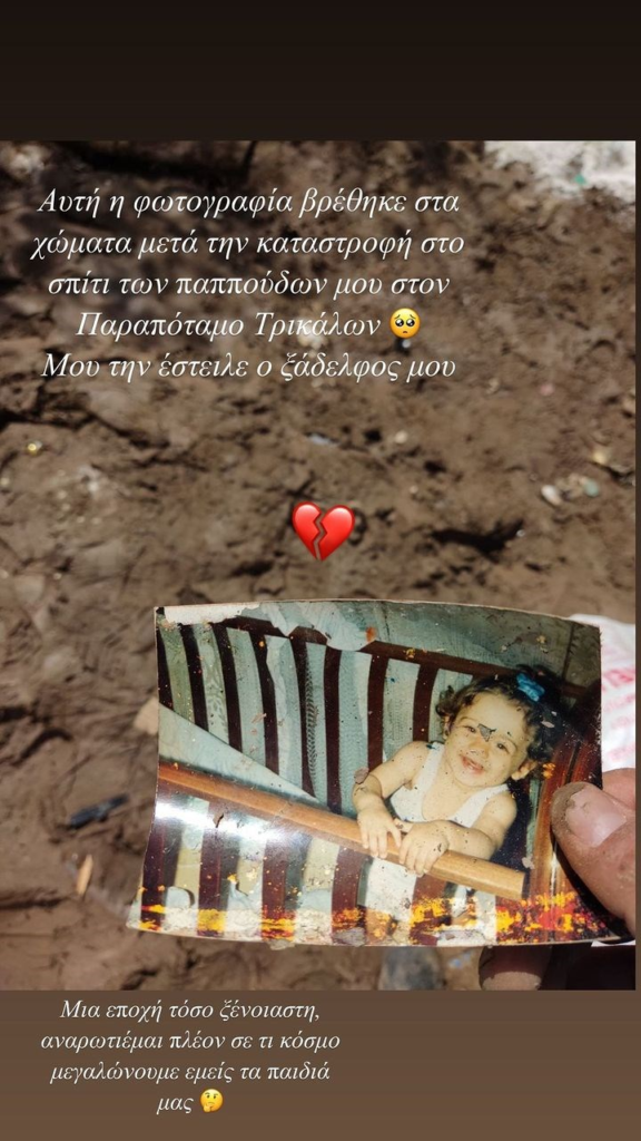 «Αυτή η φωτογραφία βρέθηκε στα χώματα μετά την καταστροφή στο σπίτι των παππούδων μου στον Παραπόταμο Τρικάλων. Μου την έστειλε ο ξάδελφός μου. Μια εποχή τόσο ξέγνοιαστη, αναρωτιέμαι πλέον σε τι κόσμο μεγαλώνουμε εμείς τα παιδιά μας», σχολίασε η Κωνσταντίνα Σπυροπούλου στην ανάρτηση της.