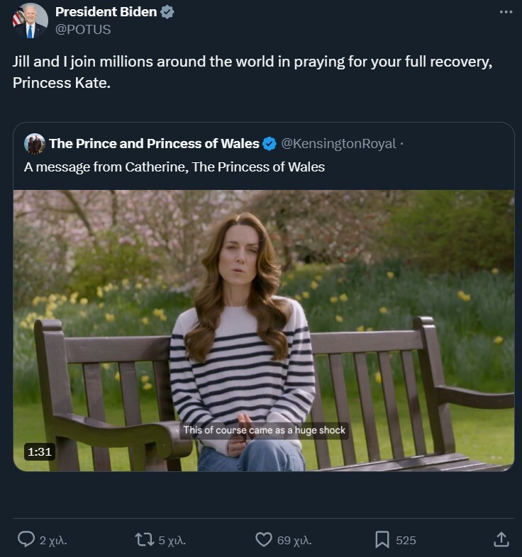Συγκεκριμένα σε ανάρτησή του στο X, ο Αμερικανός πρόεδρος δήλωσε ότι μαζί με την σύζυγό του Jill ενώνει τη φωνή του με «εκατομμύρια σε όλον τον κόσμο προσευχόμενος για την ανάρρωσή σας, πριγκίπισσα Kate».