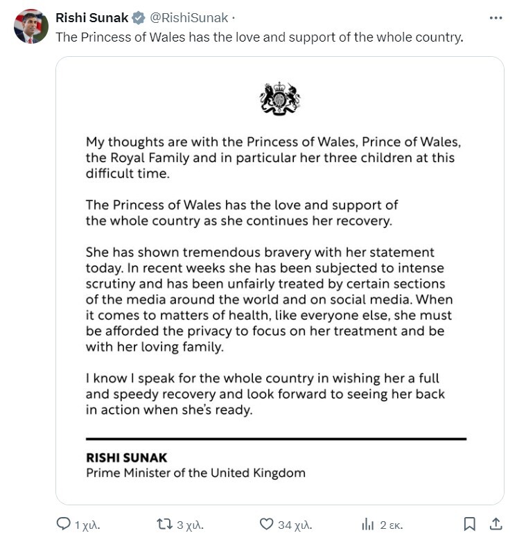 «Οι σκέψεις μου είναι με την πριγκίπισσα της Ουαλίας, τον πρίγκιπα της Ουαλίας, τη βασιλική οικογένεια και ιδιαίτερα τα τρία παιδιά της σε αυτή τη δύσκολη στιγμή. Η πριγκίπισσα της Ουαλίας έχει την αγάπη και την υποστήριξη ολόκληρης της χώρας, καθώς συνεχίζει την ανάρρωσή της. Επέδειξε τεράστια γενναιότητα με τη σημερινή της δήλωση», αναφέρει ο Rishi Sunak.