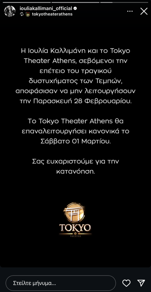 «Η Ιουλία Καλλιμάνη και το Tokyo Theater Athens, σεβόμενοι την επέτειο του τραγικού δυστυχήματος των Τεμπών, αποφάσισαν να μην λειτουργήσουν την Παρασκευή 28 Φεβρουαρίου.
