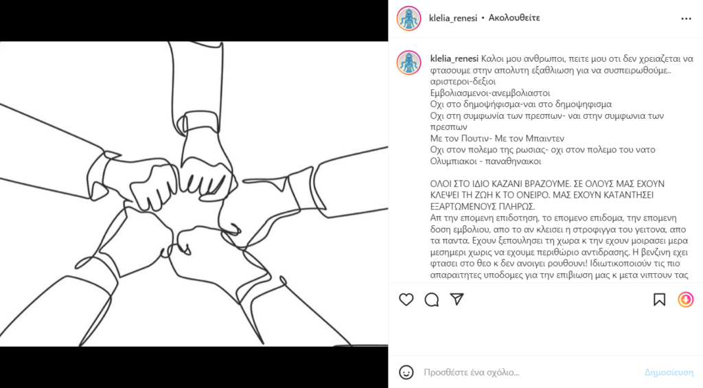 Η Κλέλια Ρένεση που είναι ιδιαίτερα ενεργή στα social media, δε διστάζει να εκφράσει ανοιχτά την άποψή της.