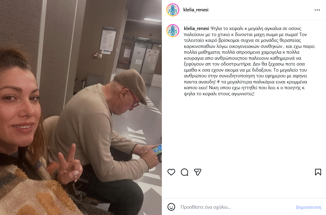 Δεν θα ξεχάσω ποτέ όσα έμαθα και όσα έχουν ακόμα να με διδάξουν. Το μεγαλείο του ανθρώπου στη συνειδητοποίηση του εφήμερου με αφήνει πάντα άναυδη! Τα μεγαλύτερα παλικάρια είναι κρυμμένα κάπου εκεί! “Νίκη όπου έχω ηττηθεί”, που λέει κι ο ποιητής, και ψηλά το κεφάλι στους αγωνιστές», έγραψε η Κλέλια Ρένεση, χωρίς να ονοματίζει το οικογενειακό της πρόσωπο το οποίο δίνει μάχη.