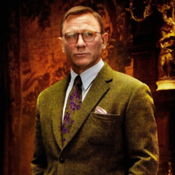 Ο Daniel Craig που υποδύεται τον ντετέκτιβ Benoit Blanc φορούσε ένα ροζ πουκάμισο και κρεμ λινό παντελόνι και ένα γαλάζιο μαντήλι στο λαιμό του.