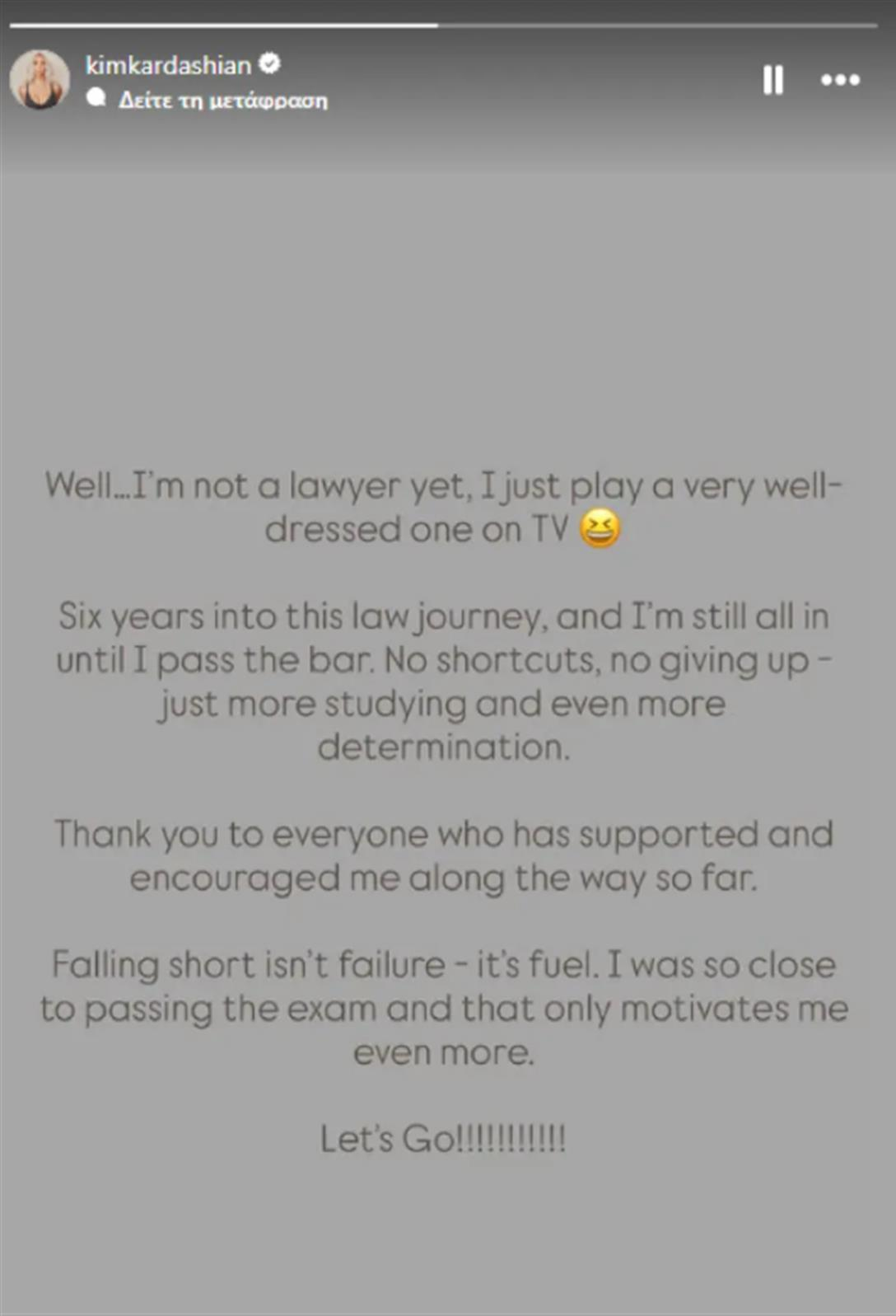 Επίσης η Kim Kardashian ευχαρίστησε «όλους όσοι την υποστήριξαν και την ενθάρρυναν» μέχρι τώρα, τονίζοντας «Το να πέσεις είναι ενέργεια και όχι αποτυχία. Ήμουν τόσο κοντά στο να περάσω τις εξετάσεις και αυτό με κινητοποιεί ακόμα περισσότερο. Πάμε δυνατά!!!».