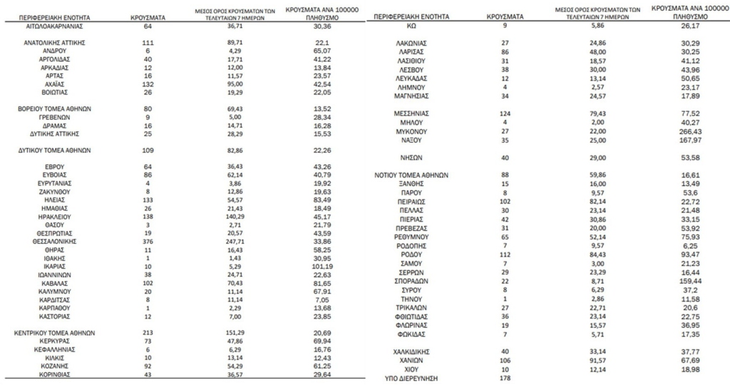 Η γεωγραφική κατανομή των κρουσμάτων ανά Περιφερειακή Ενότητα: