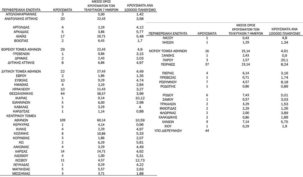 Η γεωγραφική κατανομή των νέων κρουσμάτων ανά περιφερειακή ενότητα: