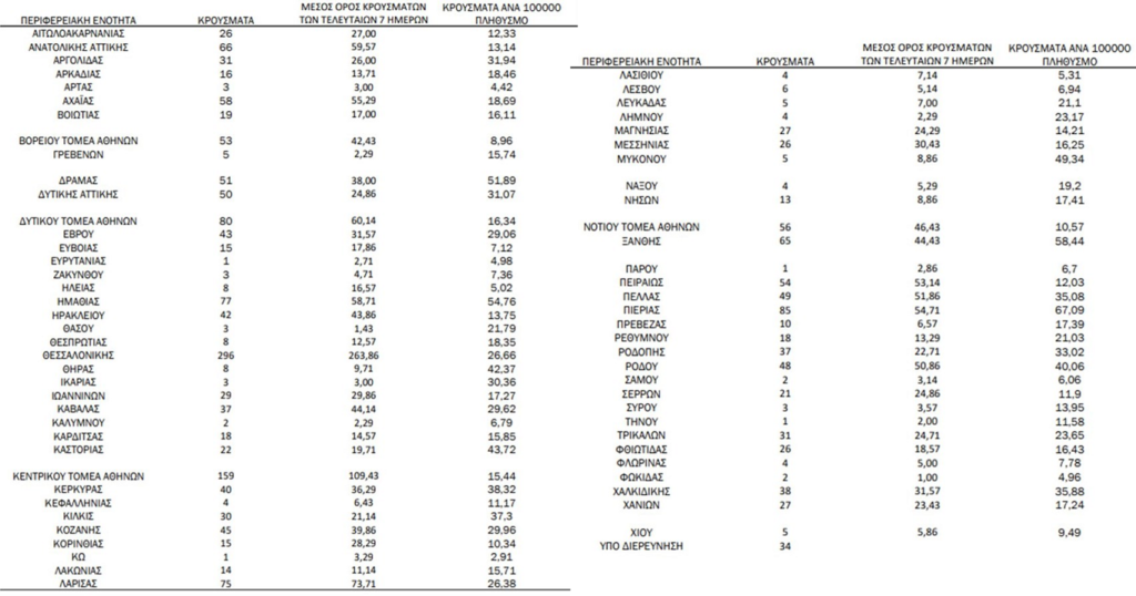 Η γεωγραφική κατανομή των νέων κρουσμάτων ανά περιφερειακή ενότητα: