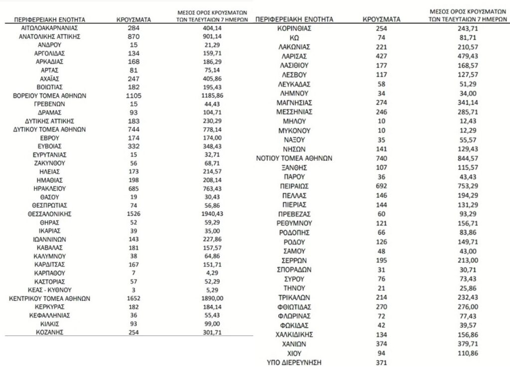 Η γεωγραφική κατανομή των νέων κρουσμάτων ανά περιφερειακή ενότητα: