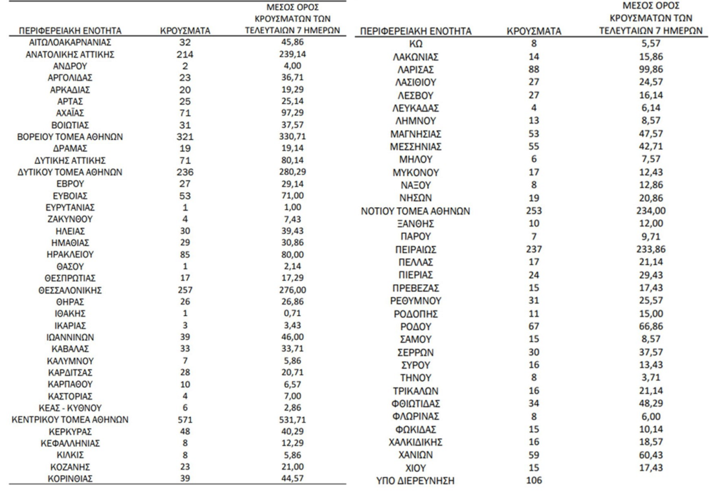 Η γεωγραφική κατανομή των νέων κρουσμάτων ανά περιφερειακή ενότητα: