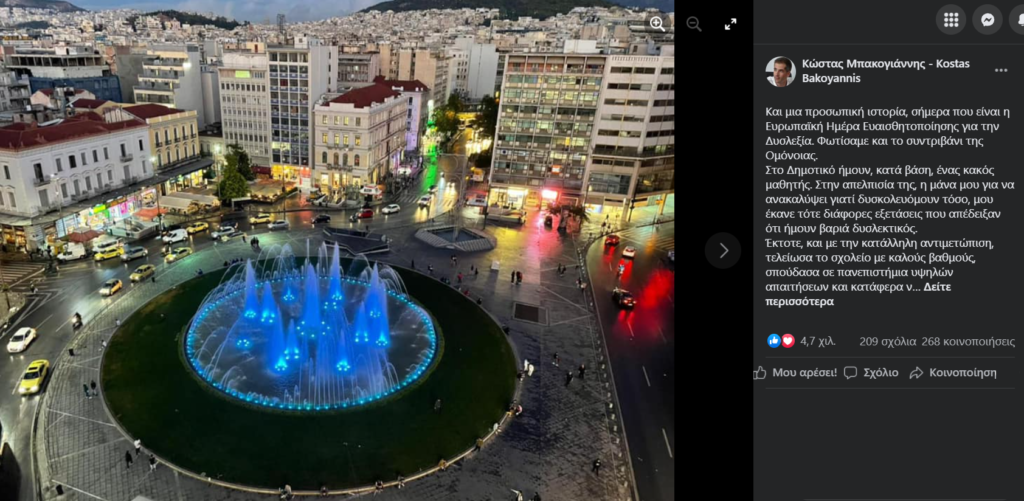 Ο Κώστας Μπακογιάννης με αφορμή την Ευρωπαϊκή Ημέρα Ευαισθητοποίησης για την Δυσλεξία, έκανε μια προσωπική αποκάλυψη δημοσιεύοντας και μια φωτογραφία με το σιντριβάνι της Ομόνοιας φωτισμένο.