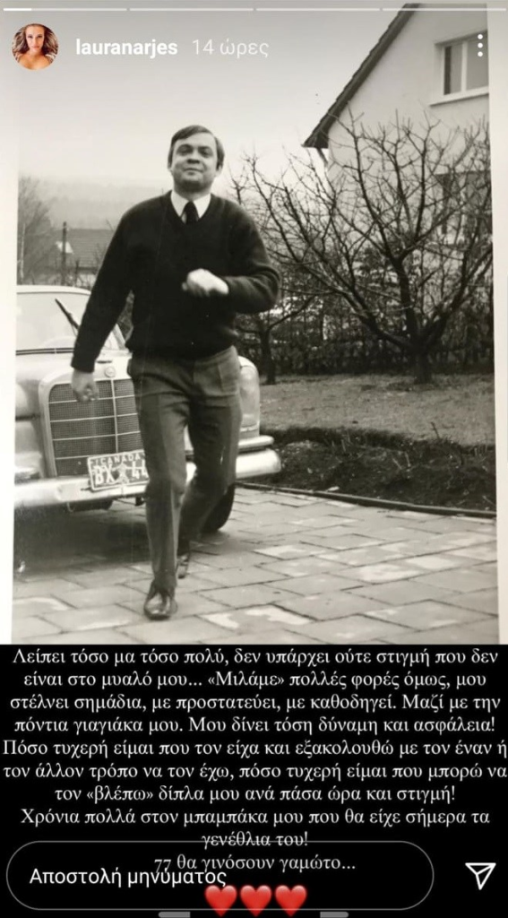 «Λείπει τόσο μα τόσο πολύ, δεν υπάρχει ούτε στιγμή που δεν είναι στο μυαλό μου… “Μιλάμε” πολλές φορές όμως, μου στέλνει σημάδια, με προστατεύει, με καθοδηγεί. Μαζί με την Πόντια γιαγιάκα μου. Μου δίνει τόση δύναμη και ασφάλεια! Πόσο τυχερή είμαι που τον είχα και εξακολουθώ με τον έναν ή τον άλλον τρόπο να τον έχω.