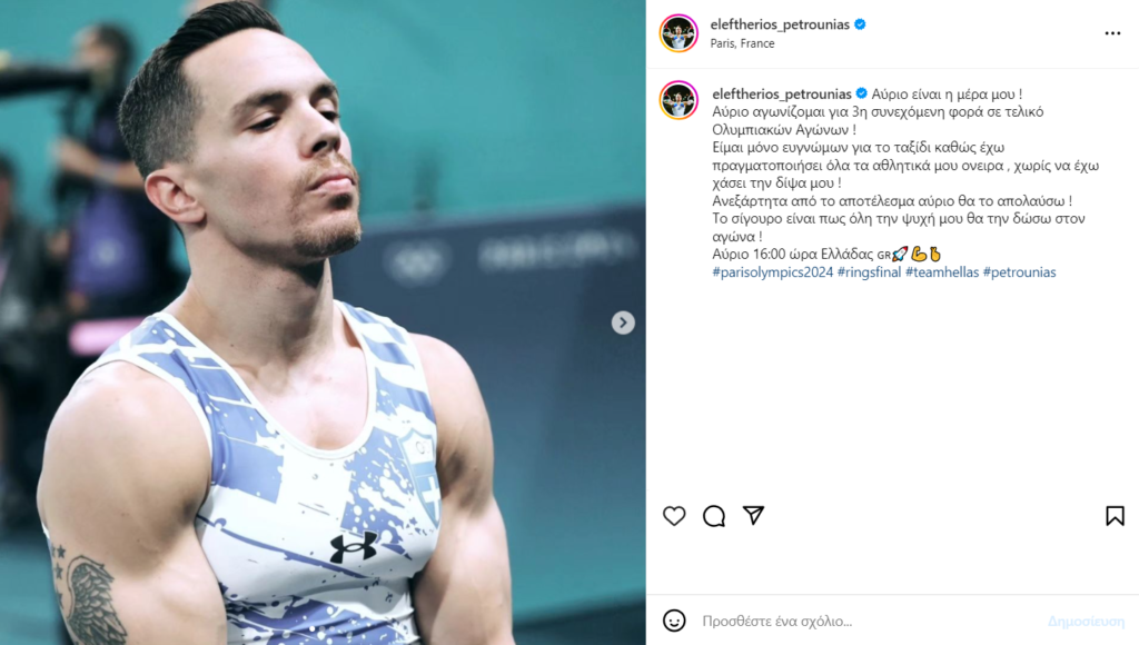 «Αύριο είναι η μέρα μου! Αύριο αγωνίζομαι για 3η συνεχόμενη φορά σε τελικό Ολυμπιακών Αγώνων! Είμαι μόνο ευγνώμων για το ταξίδι καθώς έχω πραγματοποιήσει όλα τα αθλητικά μου όνειρα , χωρίς να έχω χάσει την δίψα μου! Ανεξάρτητα από το αποτέλεσμα αύριο θα το απολαύσω !