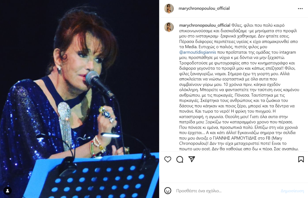 Μετά από πολύ καιρό αποχής, η Μαίρη Χρονοπούλου επέστρεψε και πάλι στα social media.