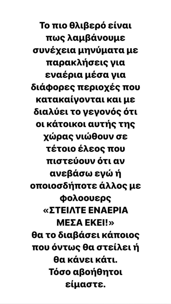 «Το πιο θλιβερό είναι πως λαμβάνουμε συνέχεια μηνύματα με παρακλήσεις για εναέρια μέσα για διάφορες περιοχές που κατακαίγονται και με διαλύει το γεγονός ότι οι κάτοικοι αυτής της χώρας νιώθουν σε τέτοιο έλεος, που πιστεύουν ότι αν ανεβάσω εγώ ή οποιοσδήποτε άλλος με followers “στείλτε εναέρια μέσα εκεί” που όντως θα στείλει ή θα κάνει κάτι. Τόσο αβοήθητοι είμαστε», έγραψε η Μαίρη Συνατσάκη στο post της.