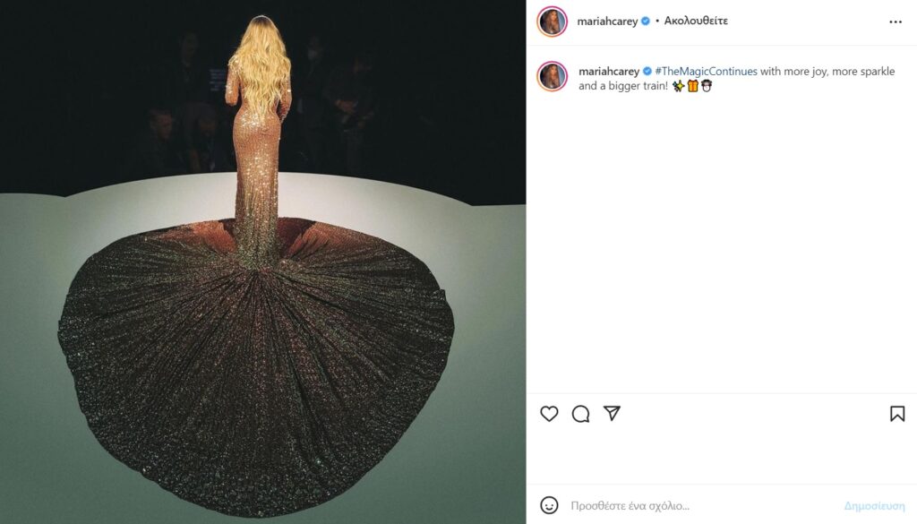 Αυτή τη φορά στο μεγαλύτερο τηλεοπτικό show που έχει κάνει ποτέ στο «The magic continues» για τη νέα εορταστική εκπομπή του Apple TV+, με τίτλο «Mariah’s Christmas: The Magic Continues», φοράει ένα περίτεχνο, χρυσό φόρεμα Dolce & Cabbana με χάντρες, με ψηλό σκίσιμο στα πόδια και τεράστια ουρά.