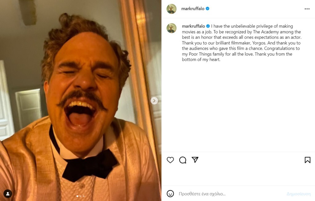 Ευχαριστούμε τον λαμπρό κινηματογραφιστή μας, Γιώργο. Και ευχαριστώ το κοινό που έδωσε μια ευκαιρία σε αυτή την ταινία. Συγχαρητήρια στην οικογένεια του Poor Things για όλη την αγάπη. Σας ευχαριστώ από τα βάθη της καρδιάς μου», έγραψε ο Mark Ruffalo στην λεζάντα του post του.