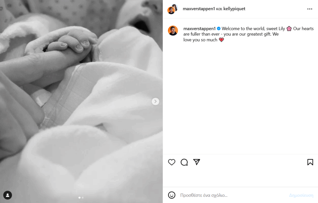 «Καλωσόρισες στον κόσμο γλυκιά Λίλι. Οι καρδιές μας είναι πιο γεμάτες από ποτέ – είσαι το μεγαλύτερο δώρο. Σε αγαπάμε πάρα πολύ», έγραψε ο Max Verstappen στη λεζάντα της ανάρτησής του.
