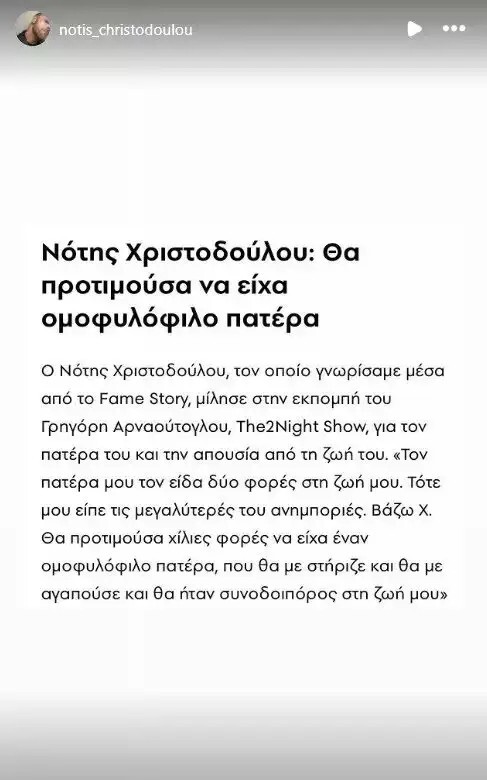 Συγκεκριμένα ο Νότης Χριστοδούλου δημοσίευσε μια ιστορία από όσα είχε πει πριν από δύο χρόνια ακριβώς στο The 2night Show όταν και είχε συναντήσει τον Γρηγόρη Αρναούτογλου στον ΑΝΤ1.