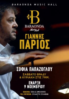 Ο Γιάννης Πάριος δίνει ραντεβού στο Baraonda Music Hall από τo Σάββατο 9 Νοεμβρίου και κάθε Σάββατο βράδυ και Κυριακή στις 19:00.