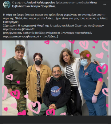 «Η τύχη τα έφερε έτσι και έκανα την τρίτη δόση φορώντας το αγαπημένο μου τι-σερτ της NASA, ίδια σειρά με την Αλέκα… (μία είναι, για μας τους παλιούς: η Αλέκα Παπαρήγα!) Σύμπτωση! Η πραγματική Μαμή της Ιστορίας και Μαμά όλων των Ανεξήγητων περίεργων συμβάντων!!! [στη φωτό σαν καθιστός Βούδας ανάμεσα σε 3 γυναίκες του πολιτικό/στρατιωτικού νοσηλευτικού + την Αλέκα…» έγραψε ο Αντώνης Καφετζόπουλος στη λεζάντα της ανάρτησής του.