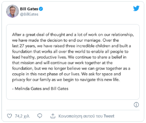 Τίτλοι τέλους φαίνεται πως έπεσαν στον γάμο του Bill και της Melinda Gates, που με ένα tweet που ανέβασε στον λογαριασμό του ο μεγιστάνας των τηλεπικοινωνιών και υπογράφει μαζί με την Melinda πήραν την απόφαση μετά από «μεγάλη σκέψη και δουλειά» να χωρίσουν.