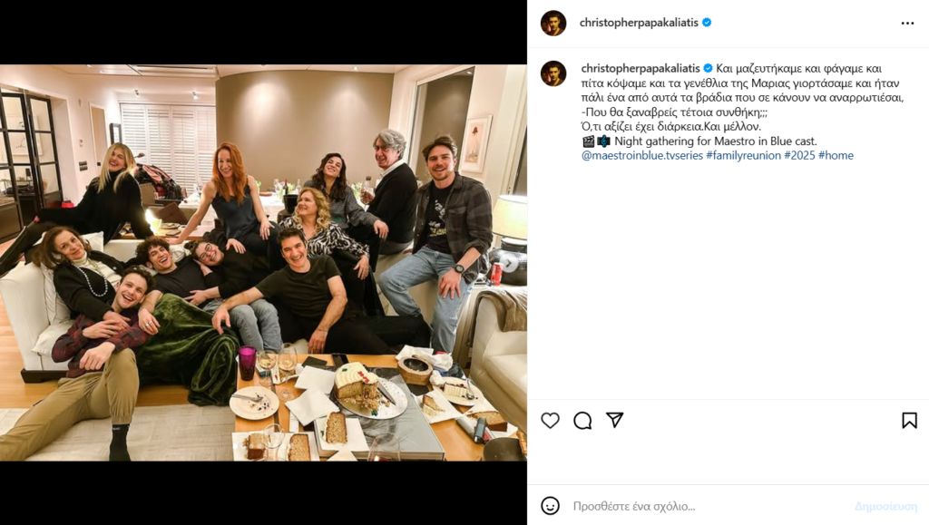 «Και μαζευτήκαμε και φάγαμε και πίτα κόψαμε και τα γενέθλια της Μαρίας γιορτάσαμε και ήταν πάλι ένα από αυτά τα βράδια που σε κάνουν να αναρωτιέσαι… -Που θα ξαναβρείς τέτοια συνθήκη;;; Ό,τι αξίζει έχει διάρκεια. Και μέλλον. Night gathering for Maestro in Blue cast», έγραψε ο Χριστόφορος Παπακαλιάτης στην ανάρτηση του αφήνοντας αιχμή για 4ο κύκλο της σειράς.