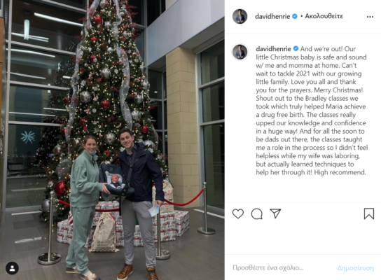 «Και βγαίνουμε έξω! Το μικρό μας χριστουγεννιάτικο μωρό είναι ασφαλές και υγιές με εμένα και τη μαμά στο σπίτι. Ανυπομονώ να αντιμετωπίσουμε το 2021 με την μικρή μας οικογένεια. Σας αγαπώ όλους και σας ευχαριστώ για τις προσευχές. Καλά Χριστούγεννα!