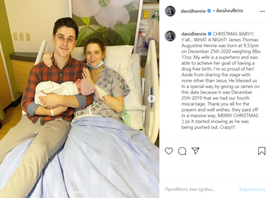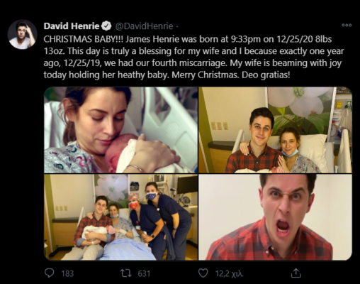 «ΧΡΙΣΤΟΥΓΕΝΝΙΑΤΙΚΟ ΜΩΡΟ !!! Ναι … ΤΙ ΝΥΧΤΑ! Ο James Thomas Augustine Henrie γεννήθηκε στις 9:33 μ.μ. στις 25 Δεκεμβρίου 2020 και ζυγίζει 8 κιλά και 13 ουγκιές. Η γυναίκα μου είναι υπερήρωας και κατάφερε να επιτύχει το στόχο της, να γεννήσει χωρίς ναρκωτικά. Είμαι τόσο περήφανος για αυτήν!
