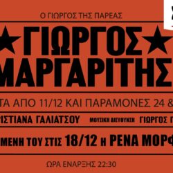 Ο Γιώργος Μαργαρίτης, «της παρέας και του καλού τραγουδιού» θα συνεχίζει τις μουσικές του παραστάσεις κάθε Σάββατο για περιορισμένο αριθμό, αλλά και τις παραμονές Χριστουγέννων (24/12) και Πρωτοχρονιάς (31/12) στη μουσική σκηνή Σφίγγα. Ο πηγαίος ερμηνευτής έρχεται στη μουσική σκηνή της Αθήνας για μια σειρά ξεχωριστών εμφανίσεων πλημμυρισμένες από σπουδαίες στιγμές, συλλεκτικές μουσικές συνευρέσεις και με μοναδικούς συνεργάτες.