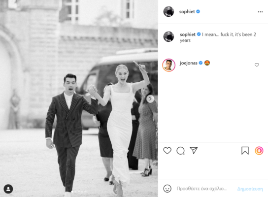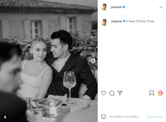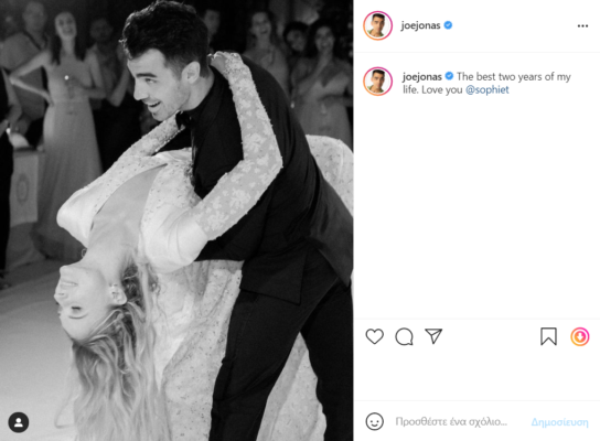 Σε μια ακόμη πιο τρυφερή ανάρτηση που ακολούθησε, ο Jonas μοιράστηκε μια αυθόρμητη φωτογραφία του με την Turner από τον γαμήλιο χορό τους, με λεζάντα, «Τα καλύτερα δύο χρόνια της ζωής μου. Σε αγαπώ @sophiet».