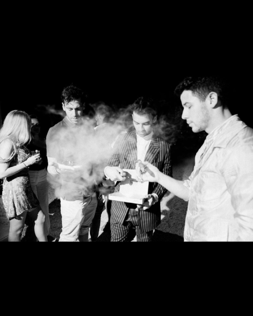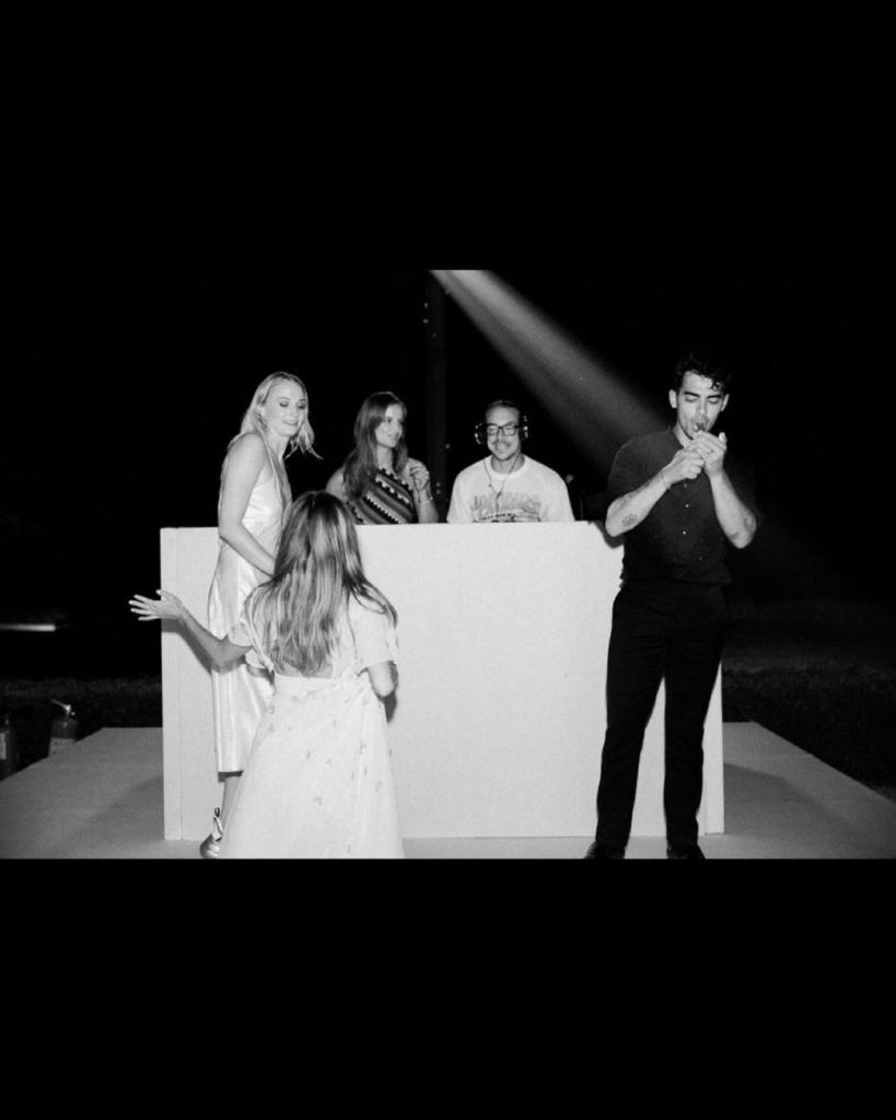 Ενώ σε άλλη φωτογραφία τα τρία αδέρφια των «Jonas brothers» ανεβαίνουν στη σκηνή της δεξίωσης με τον Joe να τραγουδά στην αγαπημένη του. Στο επόμενο στιγμιότυπο τα αδέρφια κάνουν ένα διάλειμμα καπνίζοντας πούρα και ο Diplo κάνει ένα cameo ως DJ του γάμου.