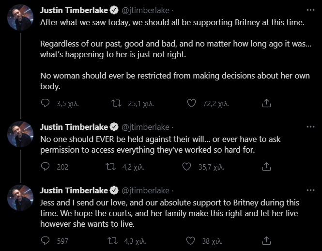 Ο Timberlake κλείνει το tweet του γράφοντας ότι αυτός και η σύζυγός τους, Jessica Biel, στέλνουν την αγάπη και τη στήριξή του στη Britney Spears. Και προσθέτει: “Ελπίζουμε ότι το δικαστήριο και η οικογένειά της θα πράξουν σωστά και θα της επιτρέψουν να ζήσει όπως το επιθυμεί”.