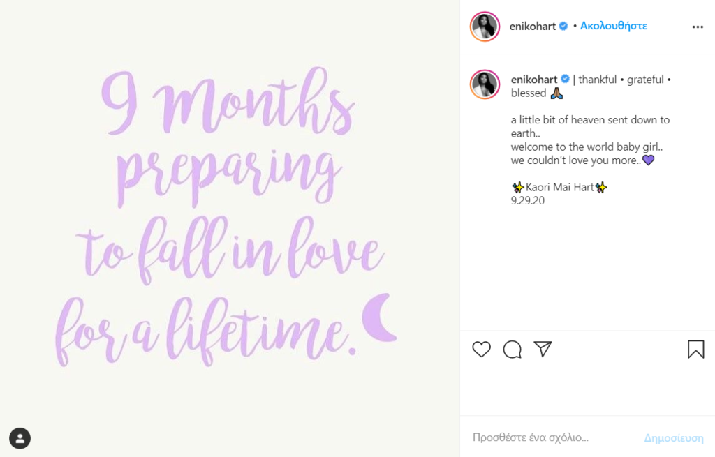 “Λίγο παράδεισος έπεσε στη γη”, έγραψε η Eniko σε ανάρτηση της στο Instagram και πρόσθεσε: “Καλώς ήλθατε στον κόσμο κοριτσάκι… δεν θα μπορούσαμε να σας αγαπήσουμε περισσότερο.”