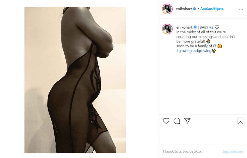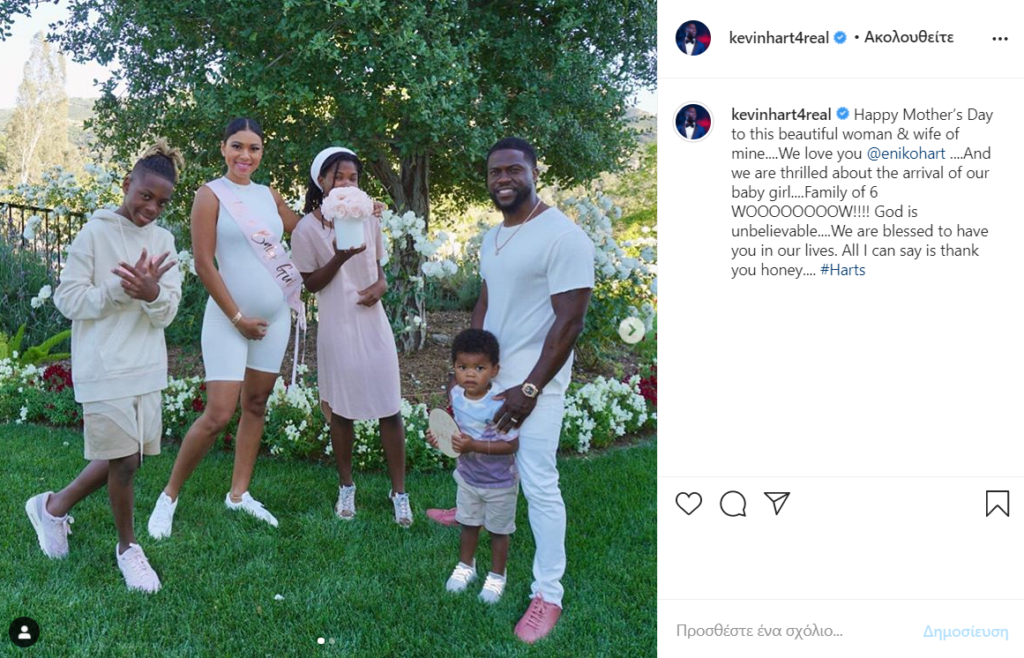 «Καλή Ημέρα της Μητέρας σε αυτήν την όμορφη γυναίκα και τη γυναίκα μου», έγραψε ο Κέβιν και πρόσθεσε “Σε αγαπάμε @enikohart …. Και είμαστε ενθουσιασμένοι για την άφιξη του κοριτσιού μας …. Οικογένεια 6 WOOOOOOOOW !!!! “Ο Θεός είναι απίστευτος. Είμαστε ευλογημένοι που σε έχουμε στη ζωή μας. Το μόνο που μπορώ να πω είναι ευχαριστώ γλυκιά μου.”