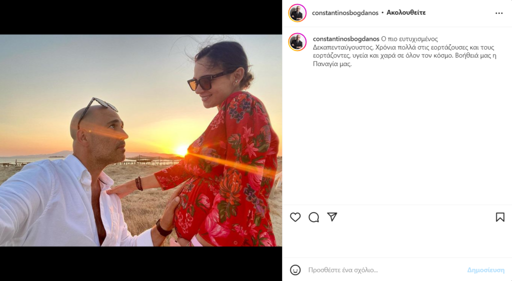 Μάλιστα, την χαρμόσυνη είδηση την έκανε γνωστή ο ίδιος ο Κωνσταντίνος Μπογδάνος ο οποίος δημοσίευσε στον προσωπικό του λογαριασμό στο instagram μία φωτογραφία με την φουσκωμένη κοιλίτσα της συζύγου του!